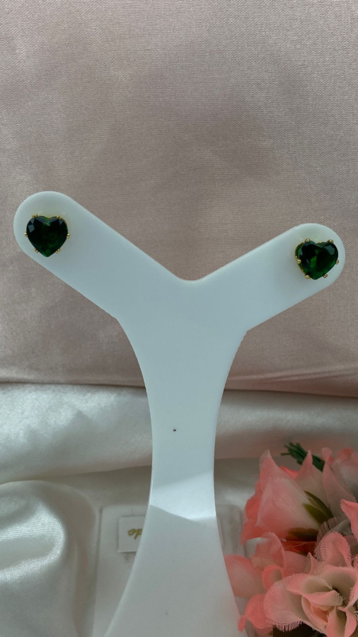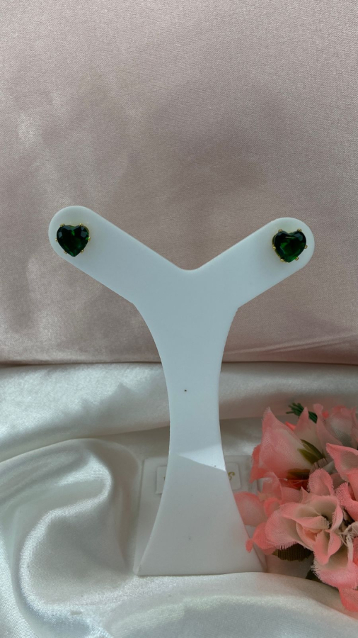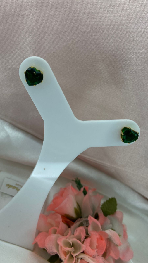 Brinco banhado a ouro com zircônia em formato de coração na cor verde. Um acessório encantador que une romantismo e sofisticação, perfeito para destacar sua beleza com um toque de elegância.