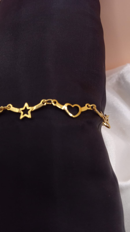 TORNOZELEIRA BANHADA EM OURO COM DETALHES EM ESTRALAS E CORAÇÕES