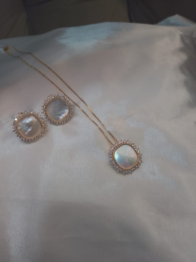 CONJUNTO BANHADO A OURO COM MADRE PÉROLA E ZIRCÔNIAS